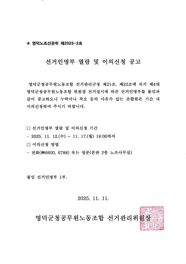 (노조선관위 제2025-2호)선거인명부 열람 및 이의신청