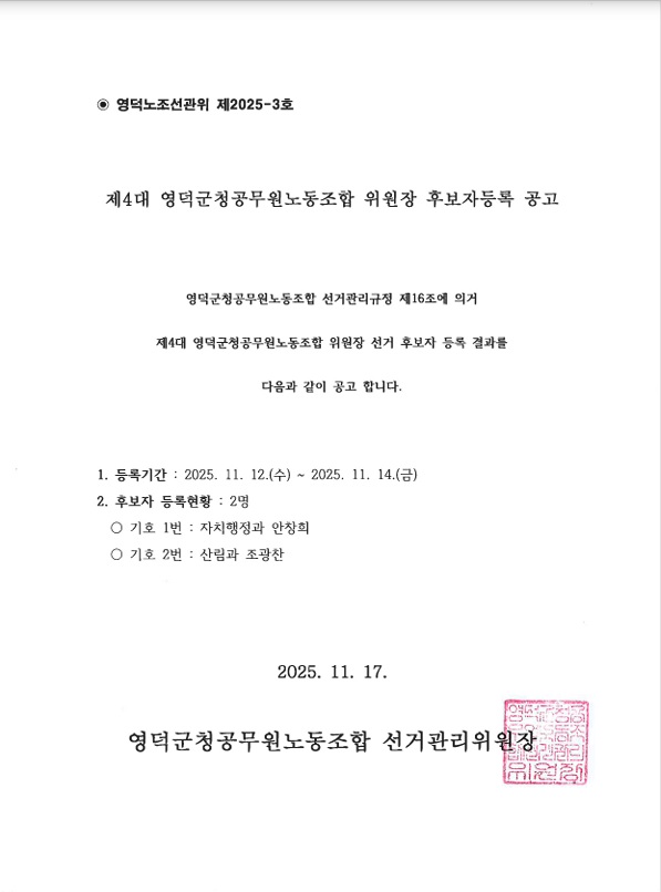 (노조선관위 제2025-3호) 제4대 영덕군청공무원노동조합 위원장 선거 후보자등록 공고.pdf