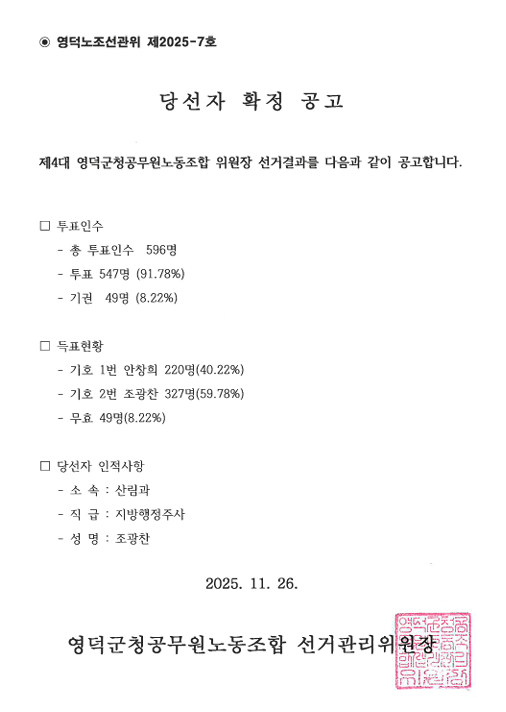 제4대 위원장 당선자 확정 공고(임기2026~2029)