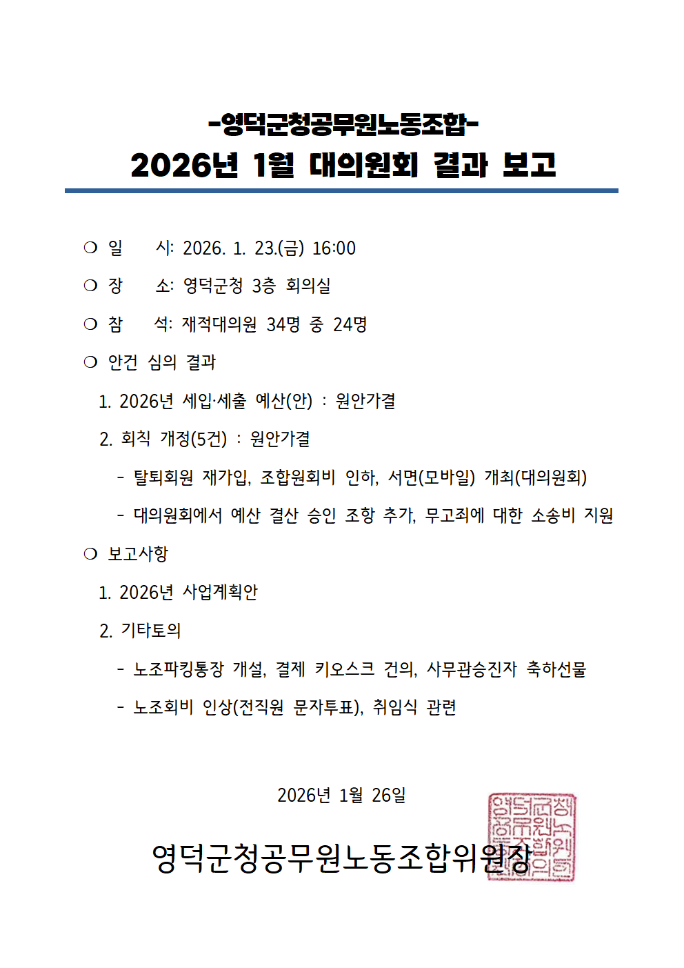 26년1월 대의원회의 결과 보고